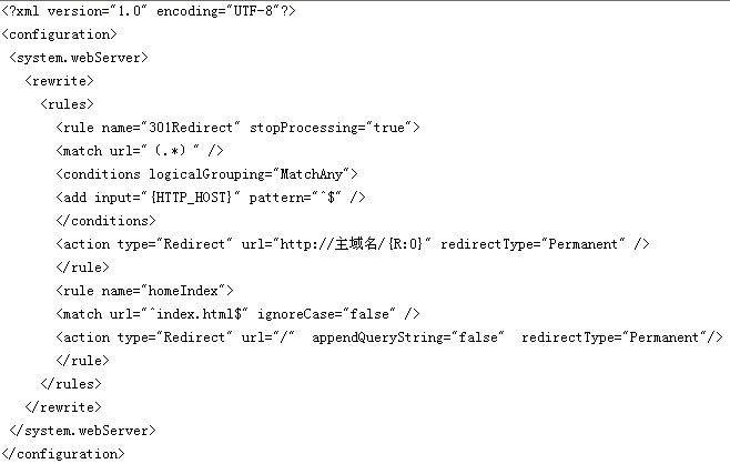然后就是基于windows平臺下的301重新定向。因?yàn)閣indows平臺下的IIS和Linux的平臺存在著一定的差別,對此需要和IDC供應(yīng)商進(jìn)行商討,了解基于windows平臺下的IIS配置。在windows平臺下,可以在根目錄下創(chuàng)建一個(gè)web.config文件,然后在這個(gè)文件中輸入下面的代碼,具體如下圖所示。